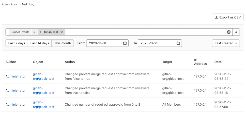 To export the Audit Events to CSV, navigate to {monitor} Admin Area > Monitoring > Audit Events