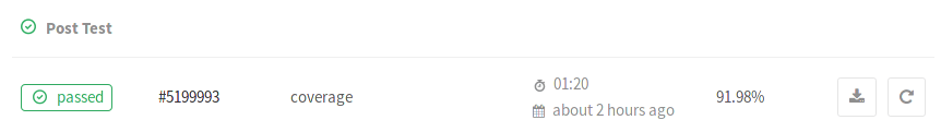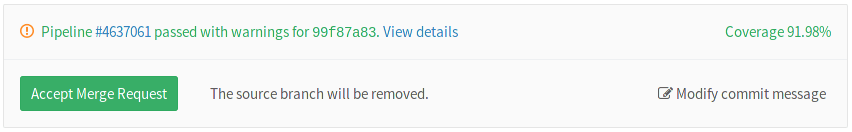 If the pipeline succeeds, the coverage is shown in the merge request widget and in the jobs table. If multiple jobs in the pipeline have coverage reports, they are averaged.