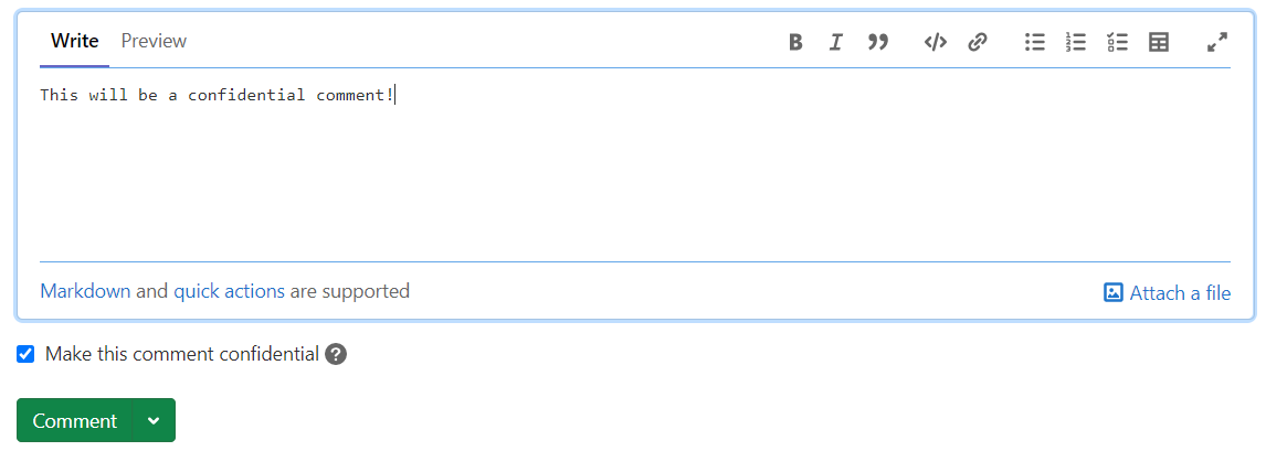 Confidential Comments is under development and not ready for production use. It is deployed behind a feature flag that is disabled by default. GitLab administrators with access to the GitLab Rails console can enable it.