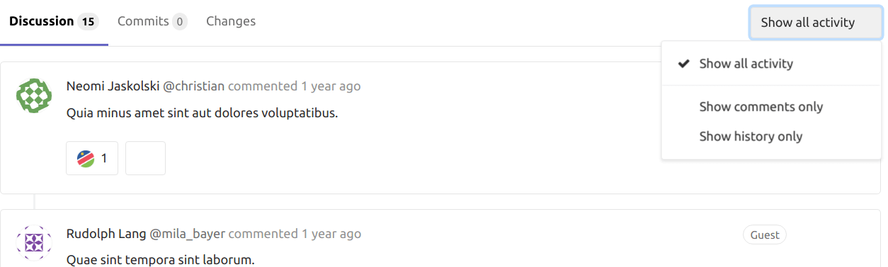 - Show all activity: displays all user comments and system notes (issue updates, mentions from other issues, changes to the description, etc).