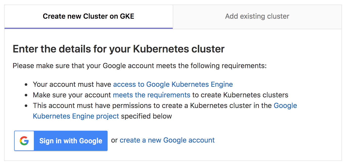 2. On the Create new cluster on GKE tab, click Sign in with Google.