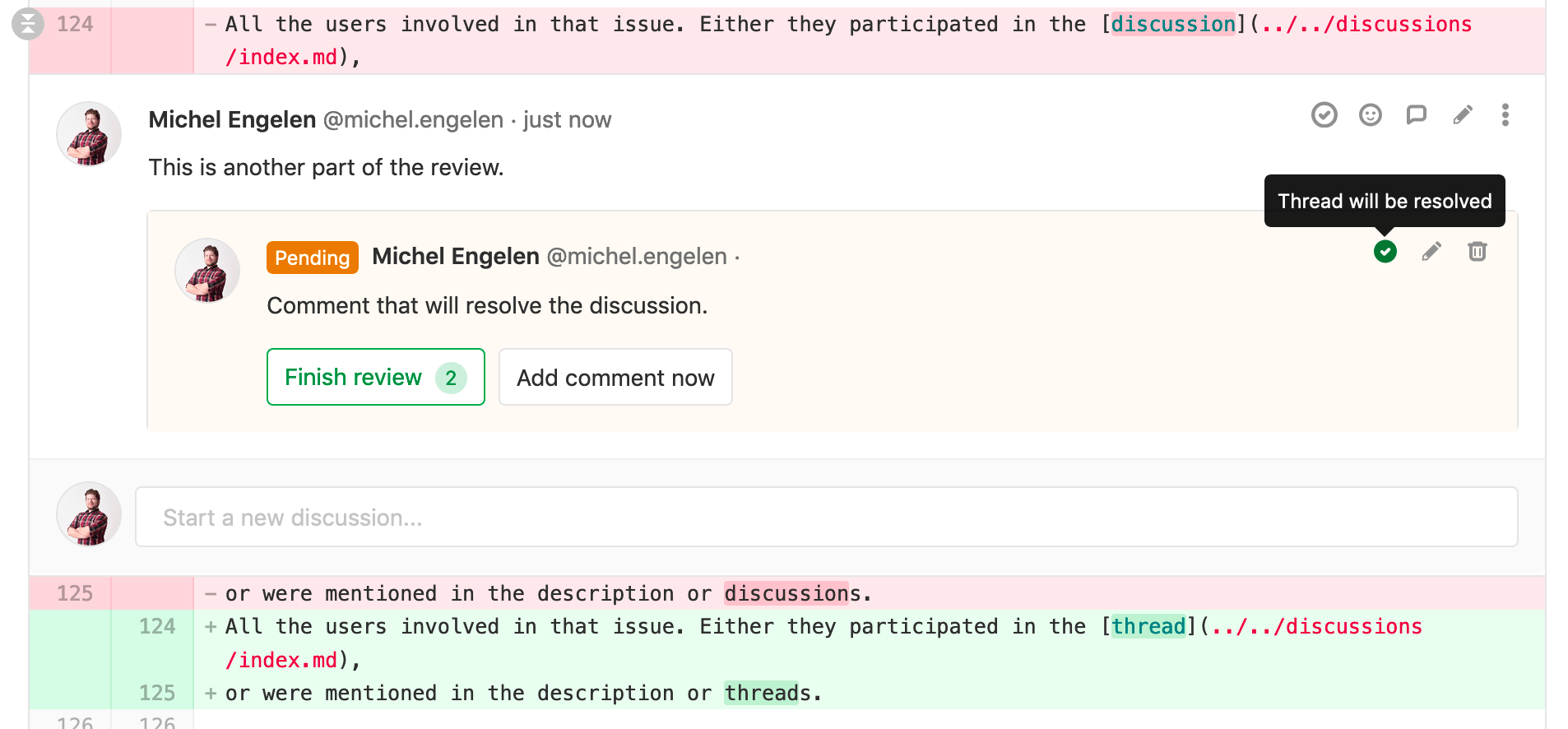 If a particular pending comment resolves or unresolves the thread, this is shown on the pending comment itself.