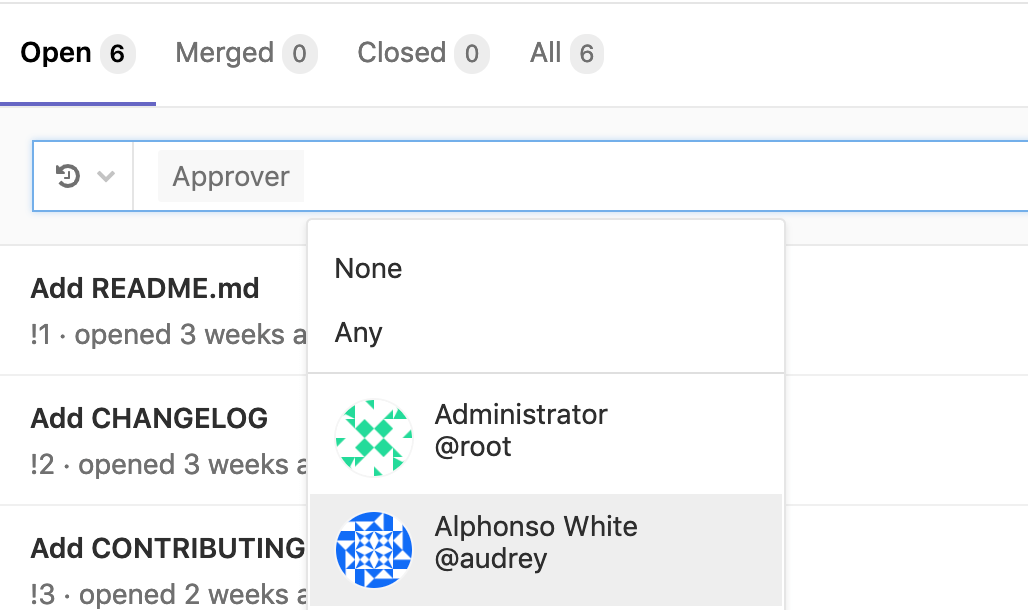 To filter merge requests by an individual approver, you can type (or select from the dropdown) Approver and select the user.