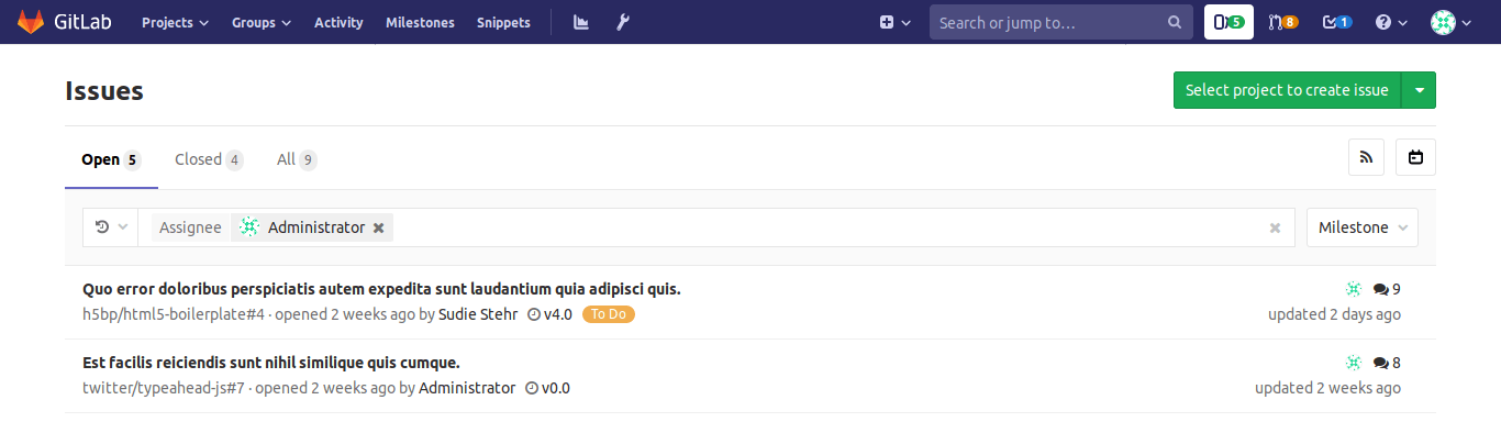 The numbers in the right-hand side of the top menu indicate how many issues, merge requests, and to-do items are assigned to you: