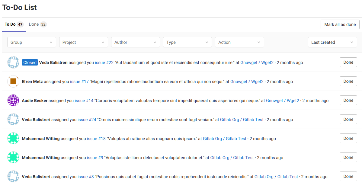 When several trigger actions occur for the same user on the same object (for example, an issue), GitLab displays only the first action as a single to do item.